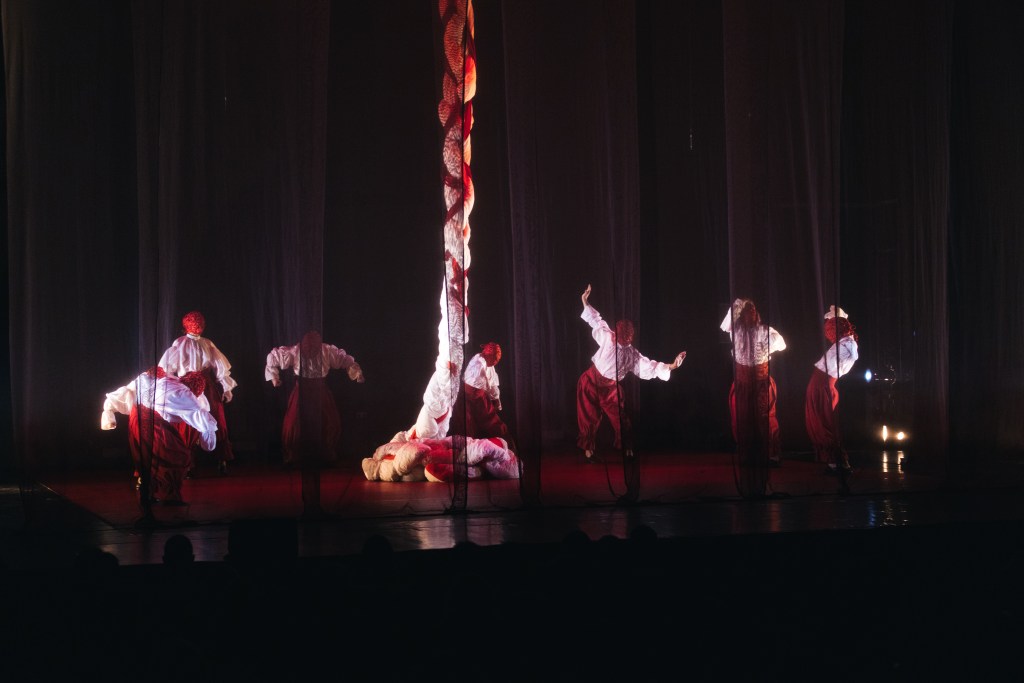Fran: Eu aquí doulle as grazas a todo o elenco que se atreveran. Eu son consciente de que non podes bailar de todo a gusto se che limitan a visión e moitos sentidos porque despois tamén temos o traballo de luces que lles reflicten na cara e é complicado. Ceibe comeza cun velo branco na boca do escenario e gustaríame destacar que eles non ven ao público ata que arrancan esas telas, como o público non ten luz para eles están no seu mundo, no seu ecosistema. Ata que rachan con eses límites non saben que de alí para alá hai máis e pódese intentar facer doutro xeito. Iso tamén é interesante e creo que ao mellor o público non é consciente, estaos vendo, pero eles non ven nada, só ven ese espacio.