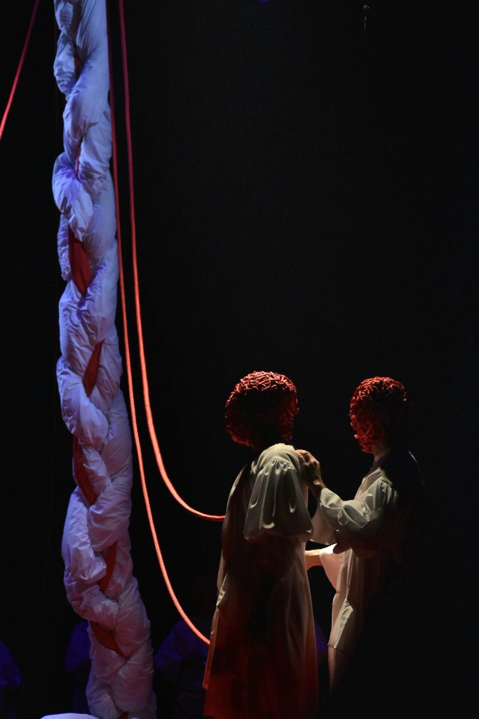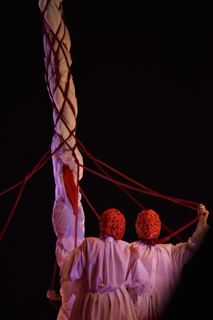 Fran: Eu quería experimentar con que o público ao principio só vira corpos. Era algo que se me metera na cabeza. Eu quería empezar dunha maneira cos corpos militarizados chegaría a dicir. Todos movéndose igual e os corpos encorsetados, pero non quería que o público nin vira xestos nin identificara se era Adrao, Artur, Aida, Adela… Só quería que viran corpos. Entón pensei que a maneira de facer iso era tapándolle o xesto. Como xa viñamos de EntreSoños, no primeiro espectáculo xa xoguei moito con máscaras, por aí foi o conto. Houbo moitas ideas e ao final quedou como esta maraña de fíos vermellos. Eu sempre pensaba nunha maraña, despois houbo unhas ideas de facer como unha bóla de luz enmarañada. Entón eu sempre tiven esta maraña metida na cabeza, esta mochila que todas levamos que nos condiciona dunha determinada maneira e sentes ás veces que encaixas ou non encaixas, de aí xurdiu. A máscara en si foi dun xeito “improvisado” con algunha idea para a creación do cartel. Foise improvisando enriba da miña cara e apareceu a máscara.